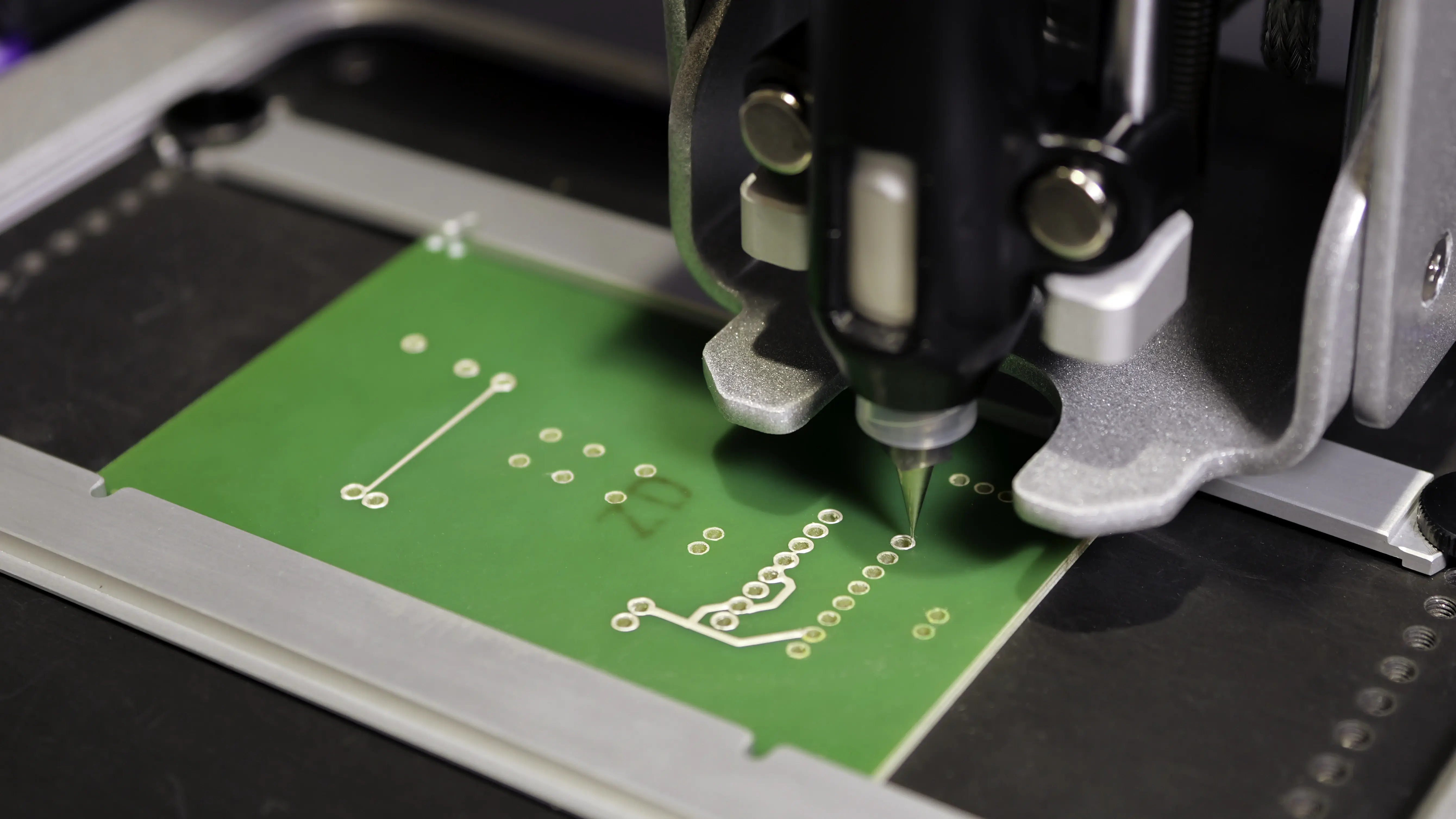 It can dispense silver ink and solder paste on materials like FR1 and FR4, enabling both the creation of conductive traces and the assembly of components, all on one machine. Depending on design complexity, you can go from digital design to an assembled PCB in under an hour.