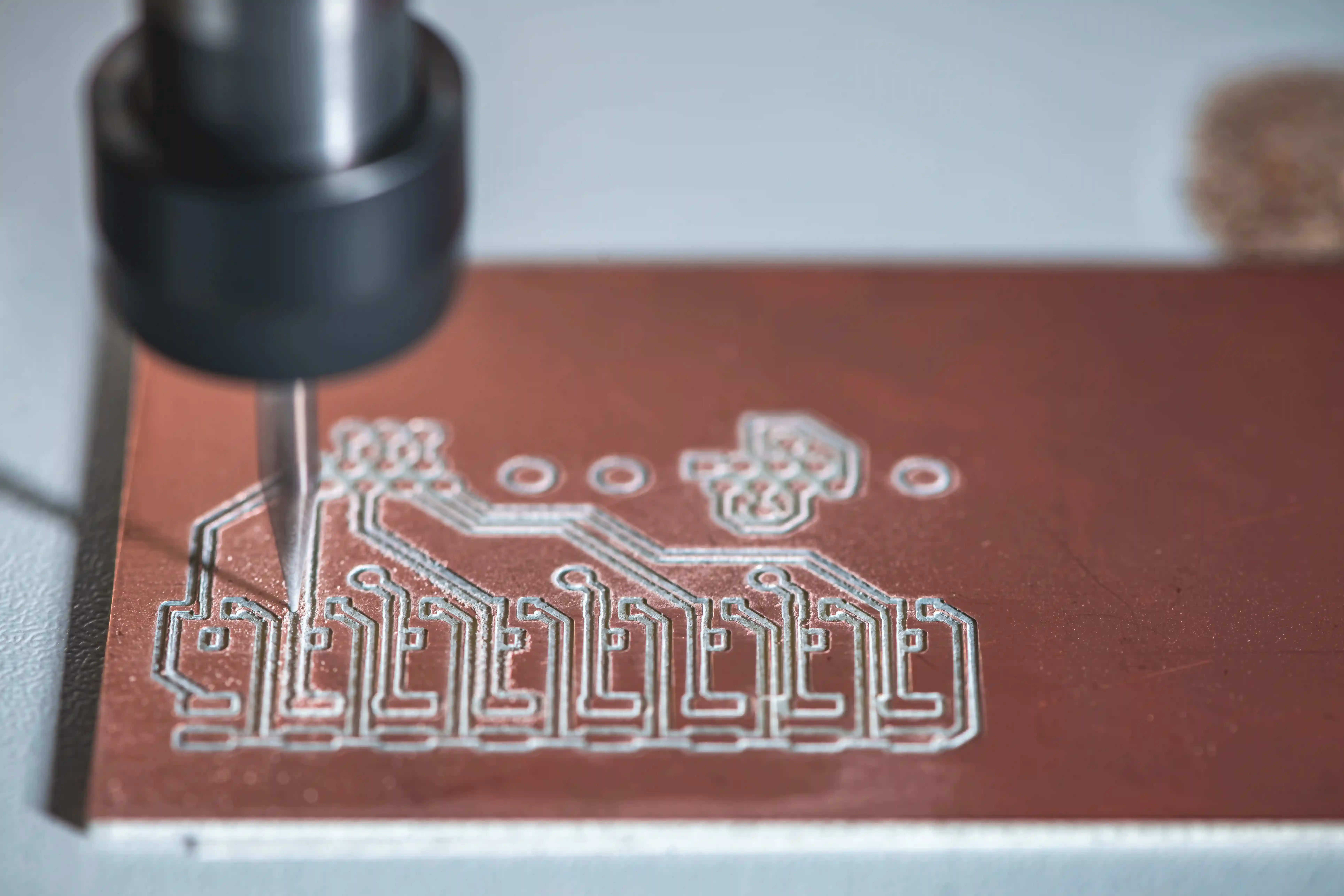 CNC milling uses a small desktop CNC router to physically mill away the unwanted copper from a copper-clad board. The ECAD design is first loaded into the CNC, which uses a very fine cutting bit to trace out the gaps between circuit traces, essentially carving out the circuit pattern from the copper layer. The result is similar to an etched board, but achieved by machining.