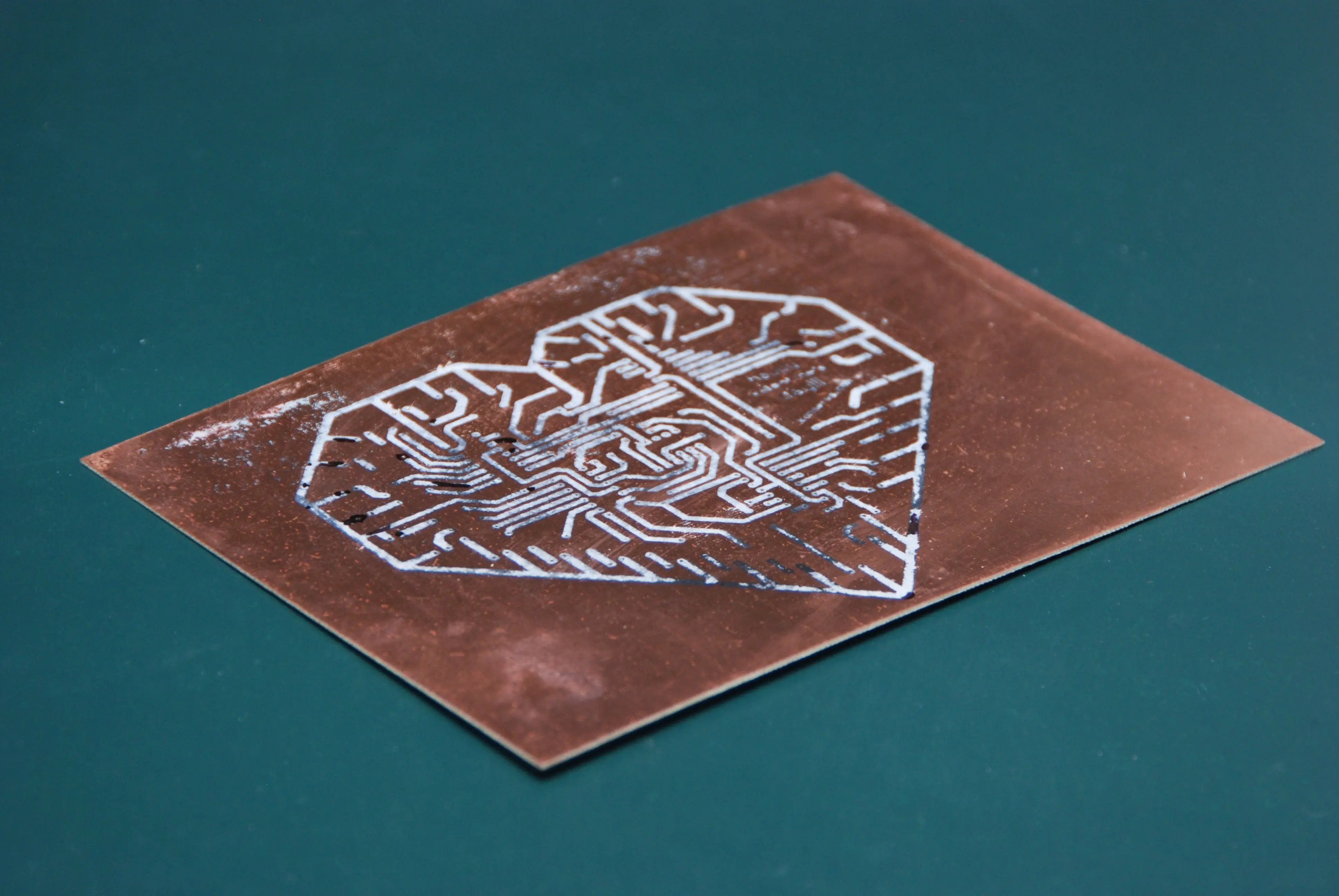 After cooling, the paper is soaked and peeled off, leaving the black toner pattern stuck on the copper as an etch resist. The board is then etched in acid, which removes copper except under the toner traces.
