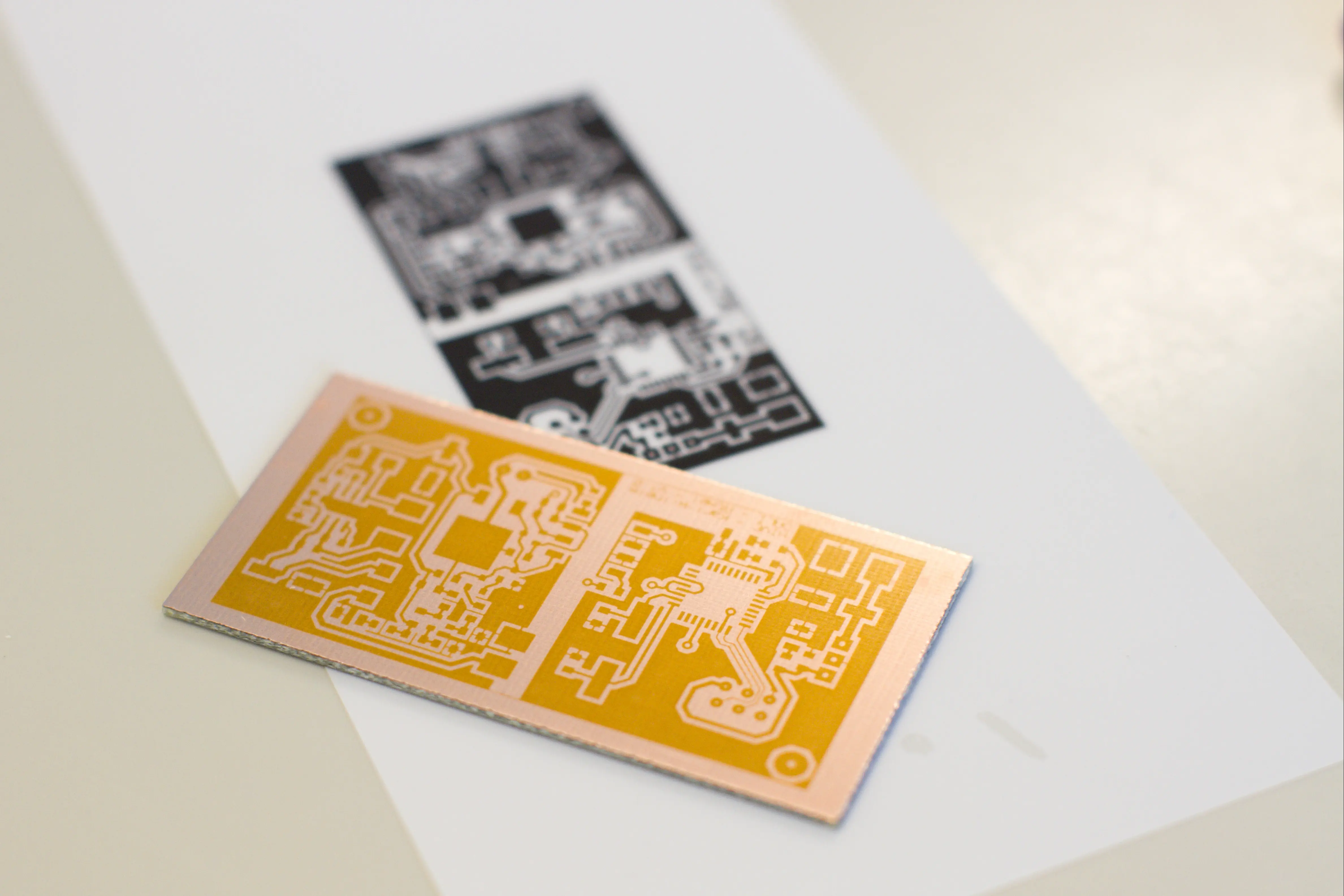 This method uses a laser printer to create the circuit pattern. The PCB layout is printed in mirror image with toner onto a special paper substrate. This print is then placed toner-side down on the copper board and heated (using a clothes iron or laminator) to re-melt the toner, which then adheres to the copper.
