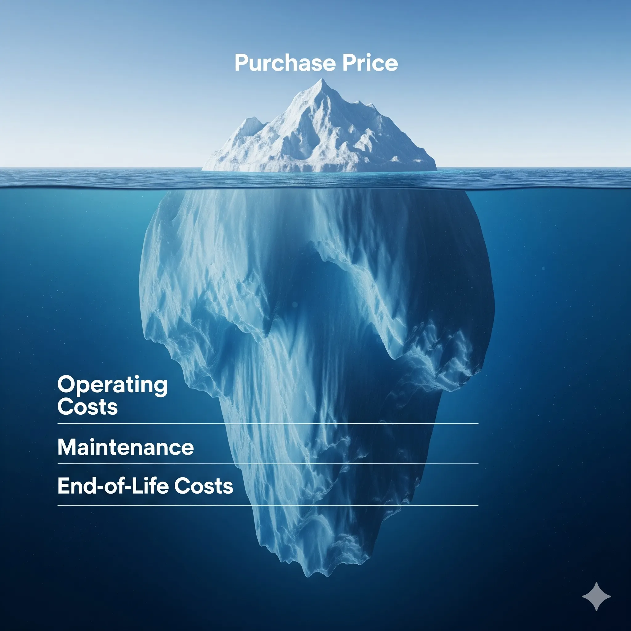 Visually, TCO is often represented by the iceberg analogy: the initial purchase price is the visible tip above the water, which most decision-makers focus on. However, this is only a small fraction of the true cost. The far more significant and frequently undermeasured hidden costs are the unseen underwater mass that determines the real financial impact over the long run.