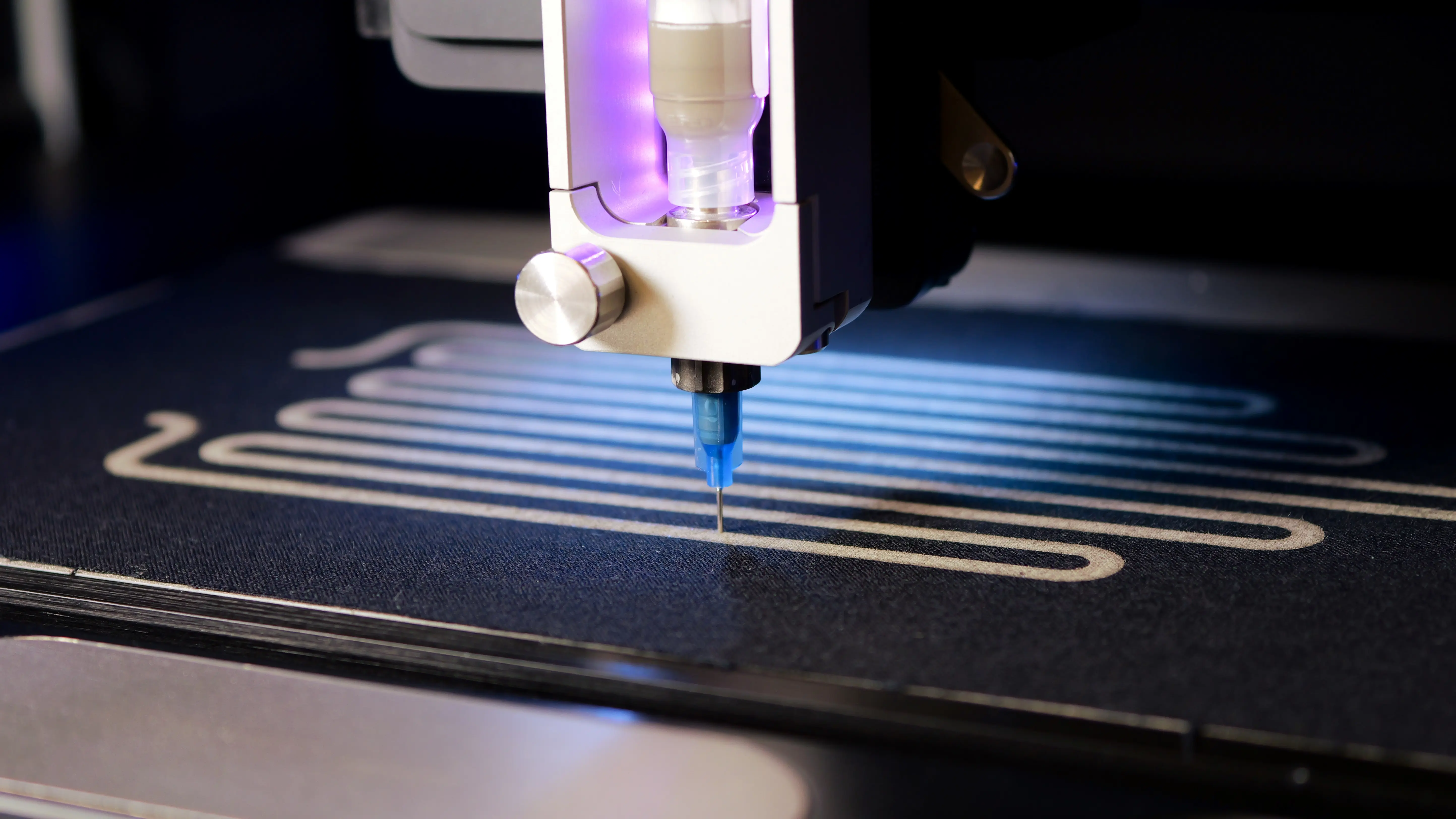 Next, Tom introduced Voltera’s NOVA materials dispensing system and its role in e-textile prototyping. NOVA supports screen printable materials, camera-assisted alignment, and multilayer printing, all of which are useful for high-quality flexible hybrid electronics applications. He then walked through a heated mitten project where conductive ink was dispensed onto cotton fabric to create a wearable heating element. To learn more about this project, check out this white paper.